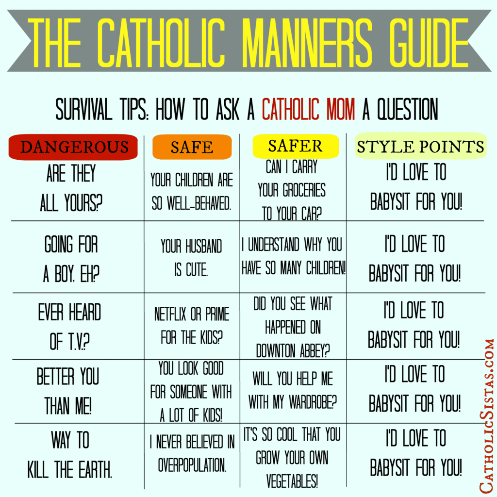 After talking to some Catholic mom friends, they were gracious enough to help me compile a condensed list of comments and questions we often hear and are faced with, many times asked in the company of our kidlet brood, which makes the situation all the more awkward for us.