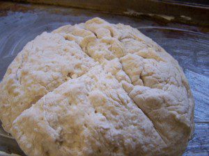 Then place it on a cookie sheet (some recipes call for the cookie sheet to be greased so you can if you want – it helps in the “is it done yet” part of the process) and cut a cross by pressing a knife down in the dough about an inch deep.