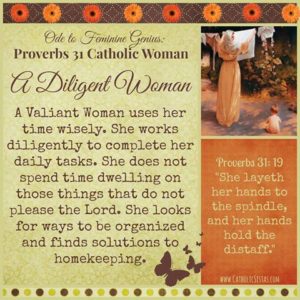 Diligence connotes tenacity and focus and enables us to maintain integrity in all our daily tasks, no matter how menial or how important. Sometimes I feel like I am so out of my league when it comes to being the diligent woman. I am not as industrious as I would like to be. I am not assiduous or even that persistent. It is clearly something I have to work at all the time. I know that my number one flaw is that I am rather complacent and sometimes downright lazy. I am a working mom; I struggle to be diligent in the classroom when I am teaching as well as when I get home. I am often tired, and the older I get, the more tired I become. There is a grace in performing what is expected of us in the face of difficulty, even when that difficulty is overcoming laziness. I have to ask myself what is it that I need to do to achieve diligence. Do I need to be more or better organized? Do I focus on my tasks as a means of achieving holiness or as pleasing to God? Do I focus on solutions rather than excuses? The diligent woman is a woman of character and integrity.