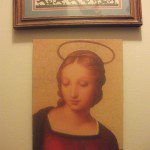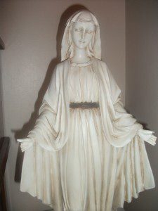 Yes, this is how our Blessed Mother sits in our home. She stands protectively over top the plastic drawers that hold our band aids at the end of the hallway. She is subject to grubby fingers rubbing her head, coloring on her dress, and breaking her outstretched fingers.