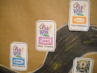 The road has the days of the Holy Week on top, and the events at the bottom of the road…leading from Palm Sunday to the Resurrection.