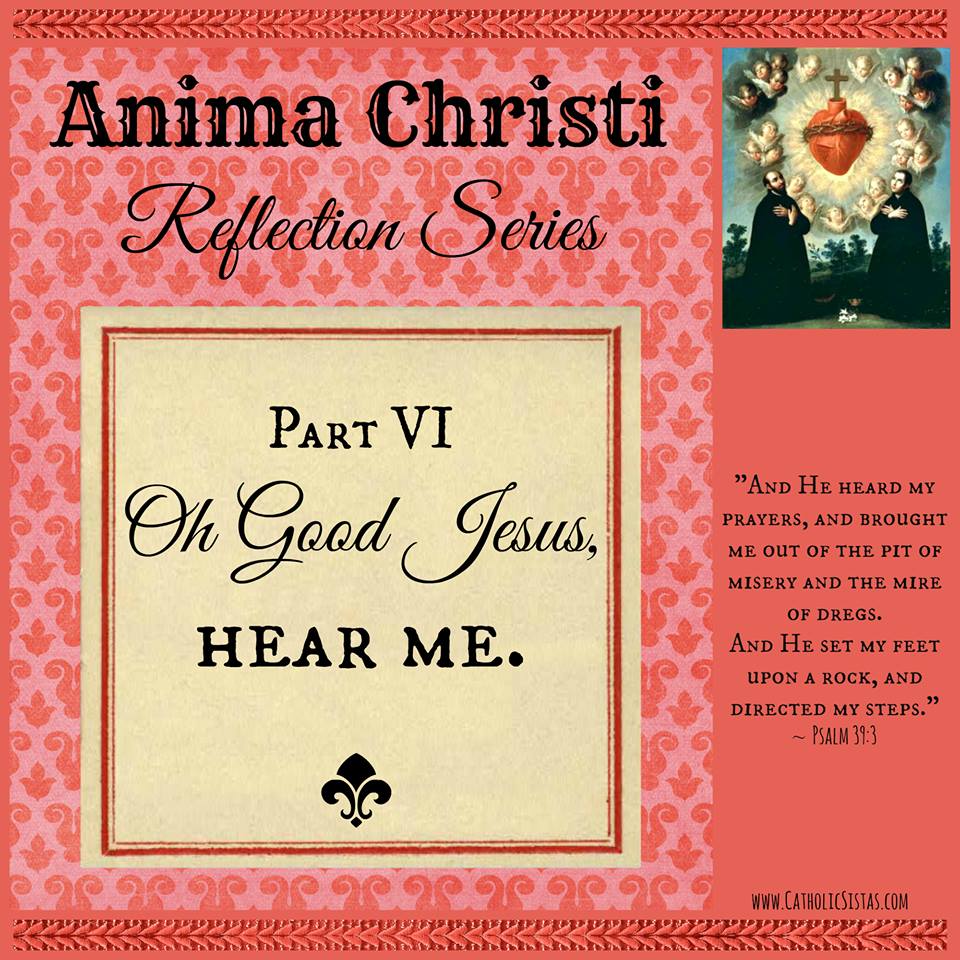 A common phrase to express surprise is “Oh sweet Jesus.” For some reason, this phrase keeps coming into my mind as I reflect on this line of the Anima Christi. Not because I am taking the Lord’s name in vain, though. In my mind, Jesus is sweet and good, interchangeably. He is the perfect listener. He hears me without interruption. He hears me in my whininess and in my desperation. He is never too tired to listen. He is never too busy to listen. He is never irritated because I am interrupting His day or what He is already doing. He is there whenever, wherever I need Him, no matter how many times a day or hour or even minute that is. He is there even when I haven’t been there, when my prayer life hasn’t been what it should be. He is still present. I read recently that when we don’t feel God’s Presence in our lives, it isn’t because He has left us, it is because we have left Him. That really changed how I pray, both for myself and my family. Now instead of asking God to stay with my family as they go through their days, I ask Him to help us stay close to Him, to help us feel His Presence as we go through our day. How do we know He is there, that He does indeed hear us? We know because we have faith. We know because when we do open ourselves to His Presence, we see Him moving in our lives. We can feel His response in the peace we feel at times. We can hear His response in those He sends to help us.