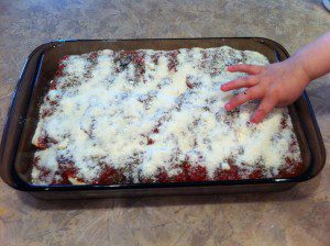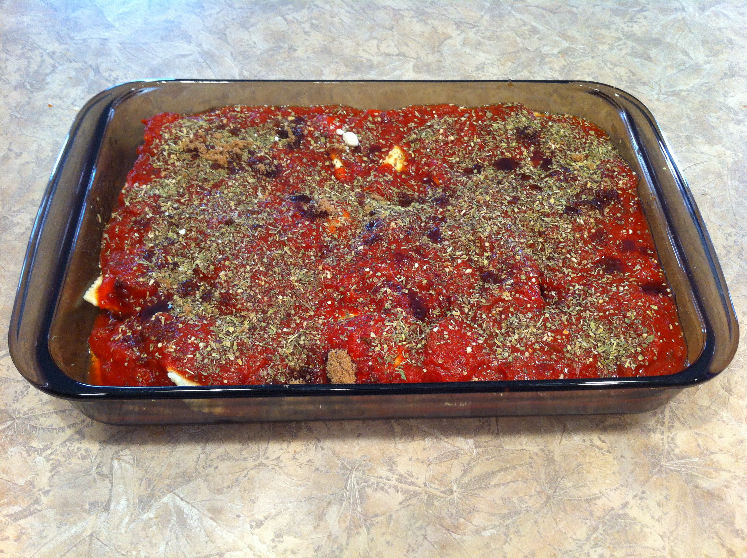 - Pour enough sauce to cover the bottom of an 8 x 13 pan.