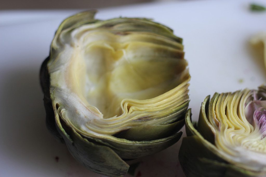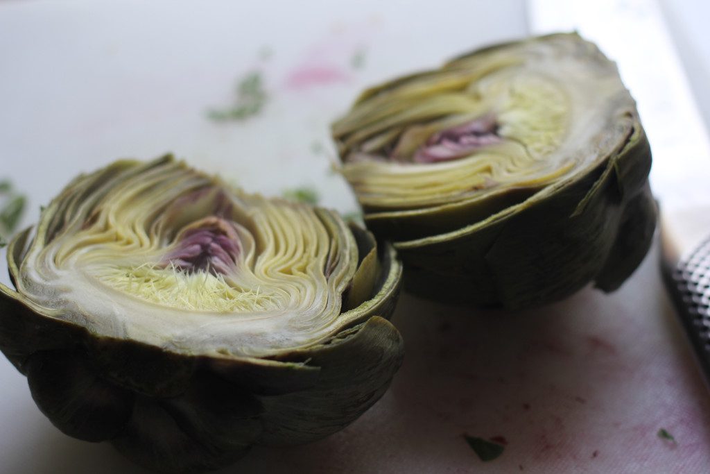Drain and and cool your cooked artichokes. When they are cooled enough to handle, cut them in half with a very sharp knife. Remove the inner petals and “hairs”.