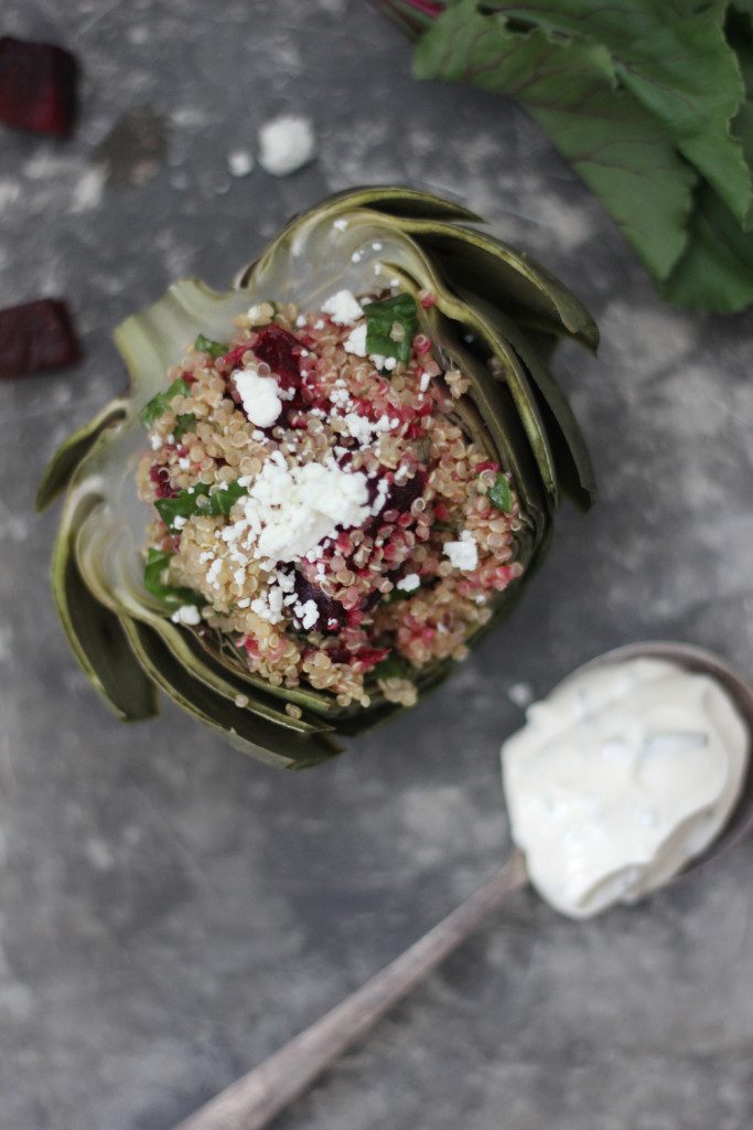 In a bowl with your cooled quinoa add chopped spinach, some fresh Thyme, salt, Feta, and mix together. Prepare the dressing separately, and add it to the quinoa fluffing and mixing to coat everything. When making the stuffing, I waited until the last minute to add the beets so that they didn’t dye everything pinkish purple. Set aside.