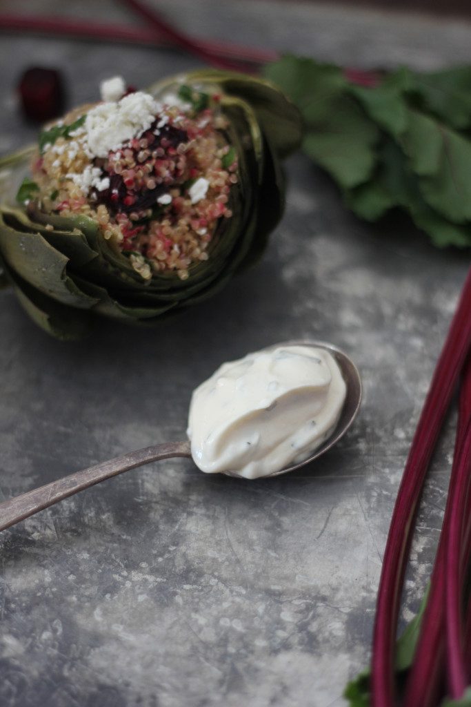 Using a large serving spoon, fill each half with the quinoa stuffing and place them on a plate. Sprinkle the top with extra Feta for a pretty presentation. And serve with a side of Garlic and Tarragon Aioli. You can eat this at room temperature, or cooled. Full recipe follows the photographs.