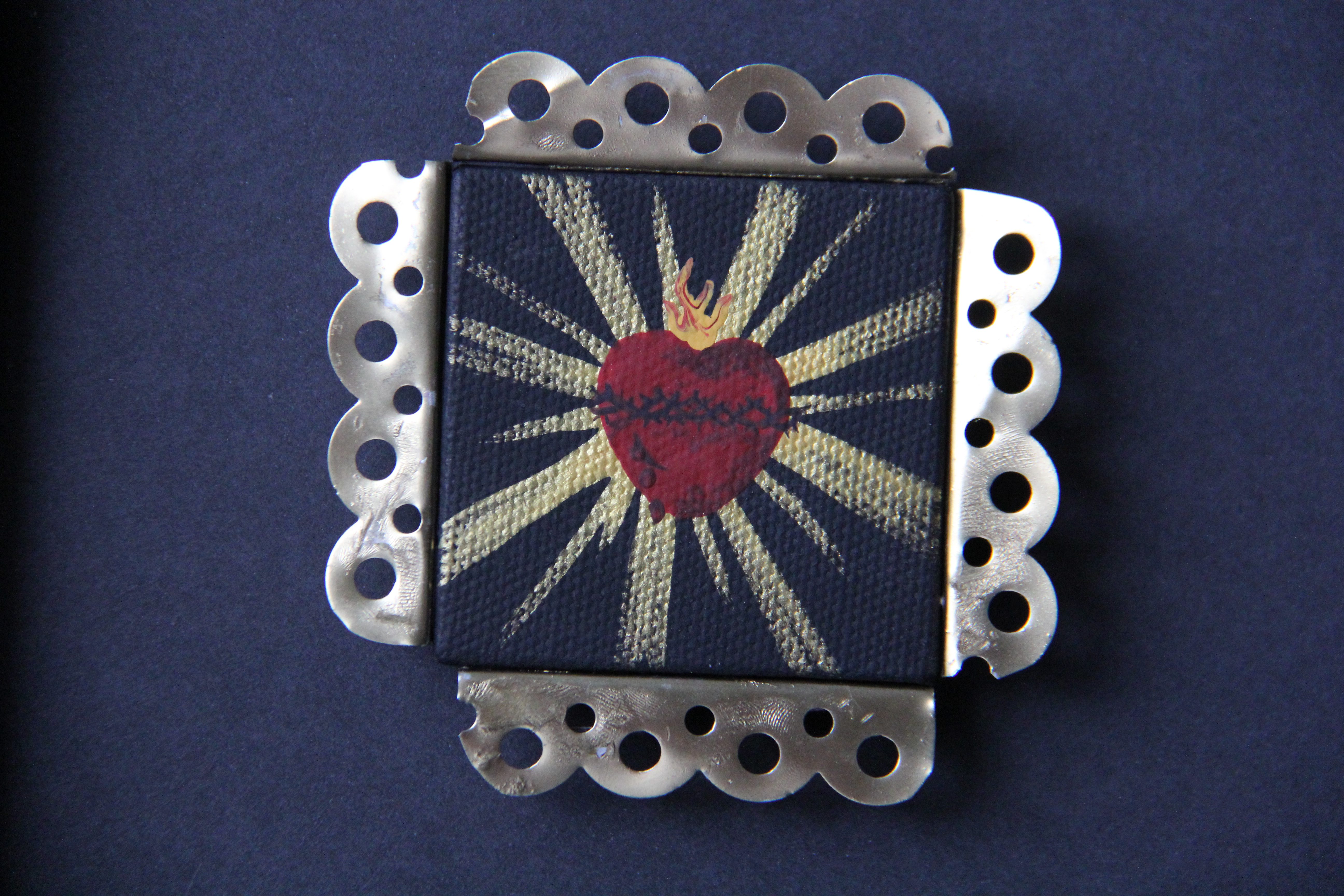 At this point, you can call your painting done if you are happy with how it looks! If you are a bit artsier, you can darken some more red paint and add in some shading to your heart. Or leave it simply the way it is. If you are up to putting a clear coat on your art piece, I would let it dry at least overnight before spraying it and then give it a good 24 hours before framing it in your choice of frame. For my piece, I chose to use some tin and a hole punch to make a frame in the Mexican folk art style, but you could choose a premade frame in as ornate or simple as style as you like.