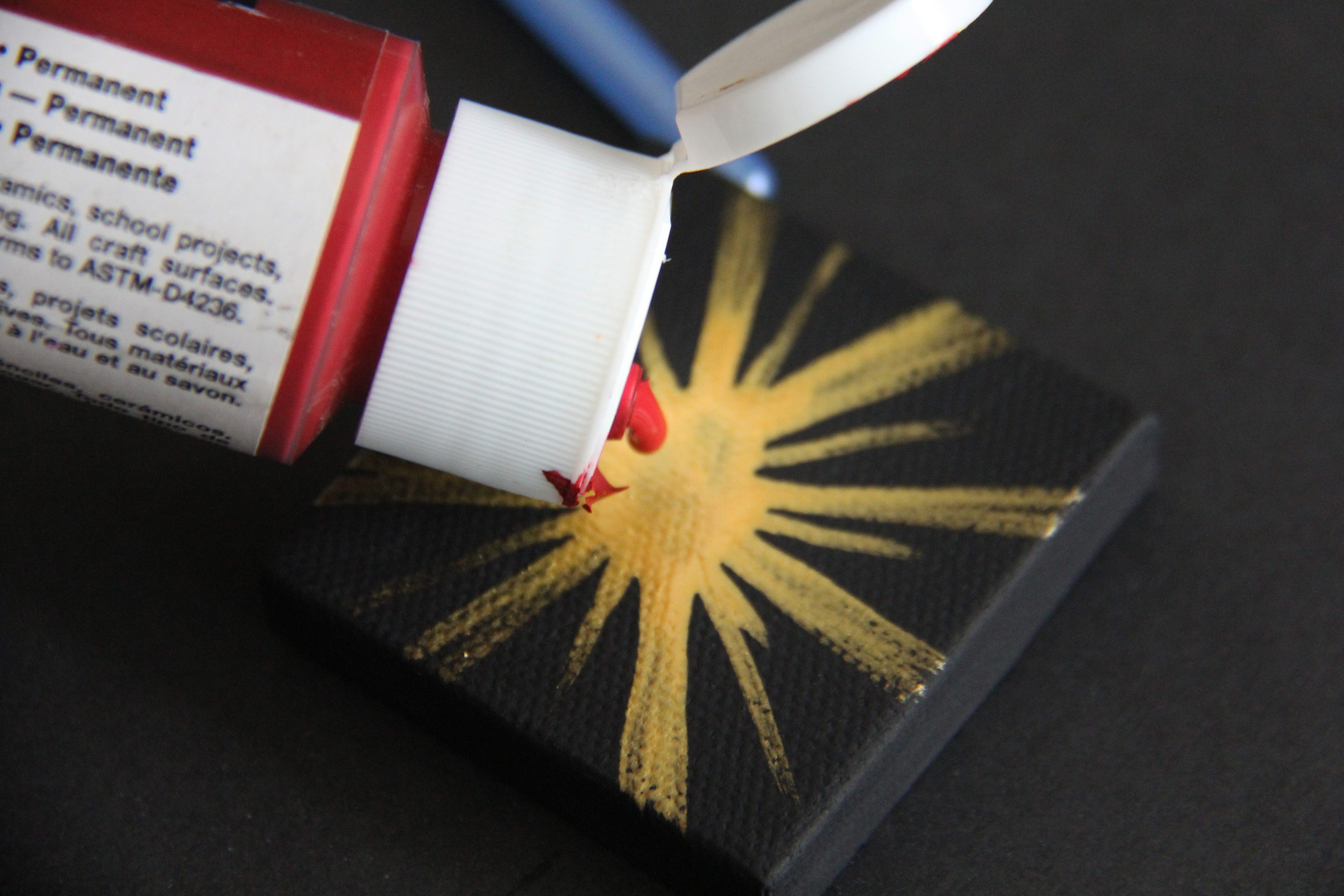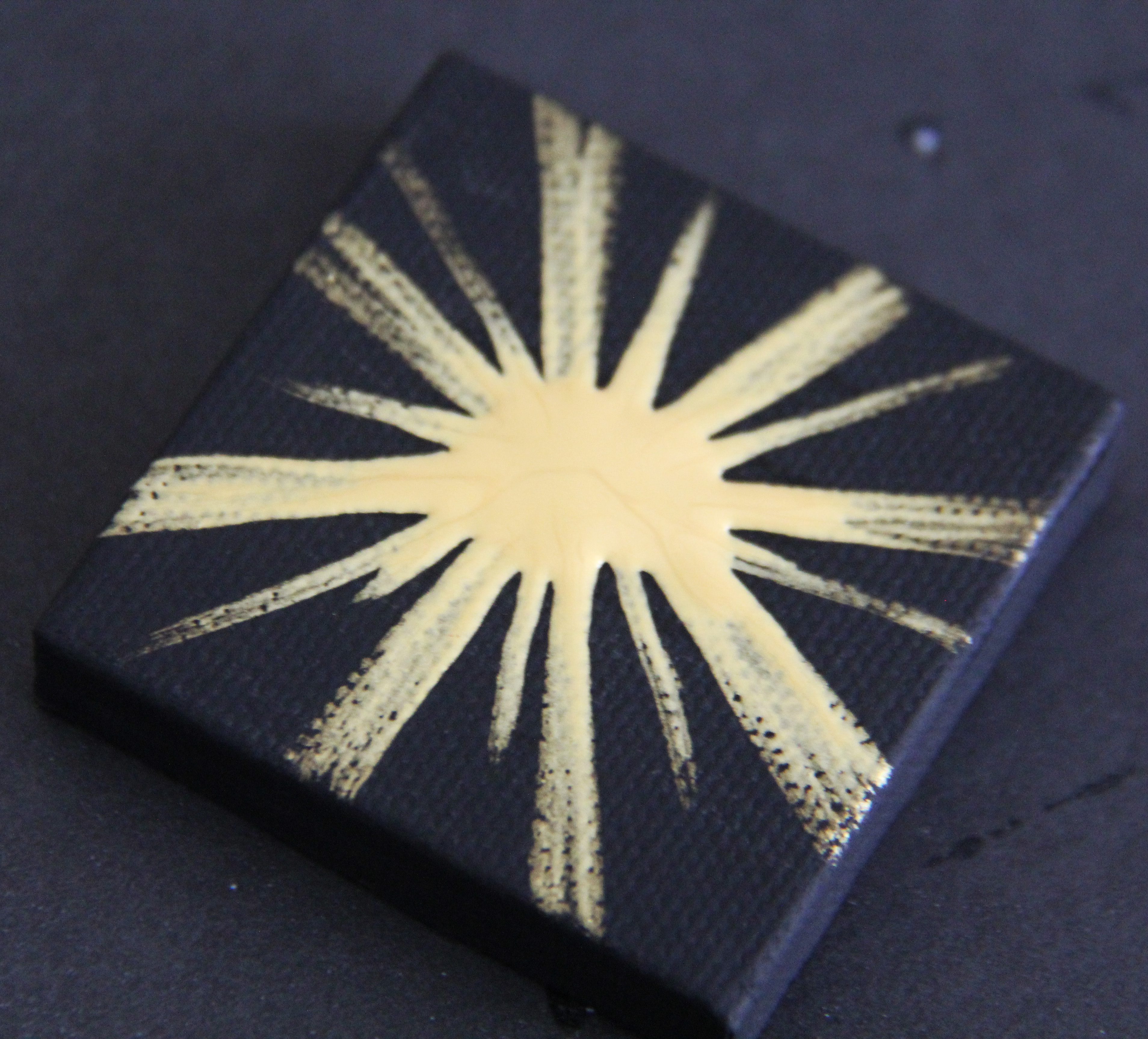 Next, put a nickel-sized puddle of gold paint in the middle of your canvas and using your round brush draw the paint outwards from the middle in even strokes to imitate light shining from within. Again, let the paint dry or dry it with a dryer.