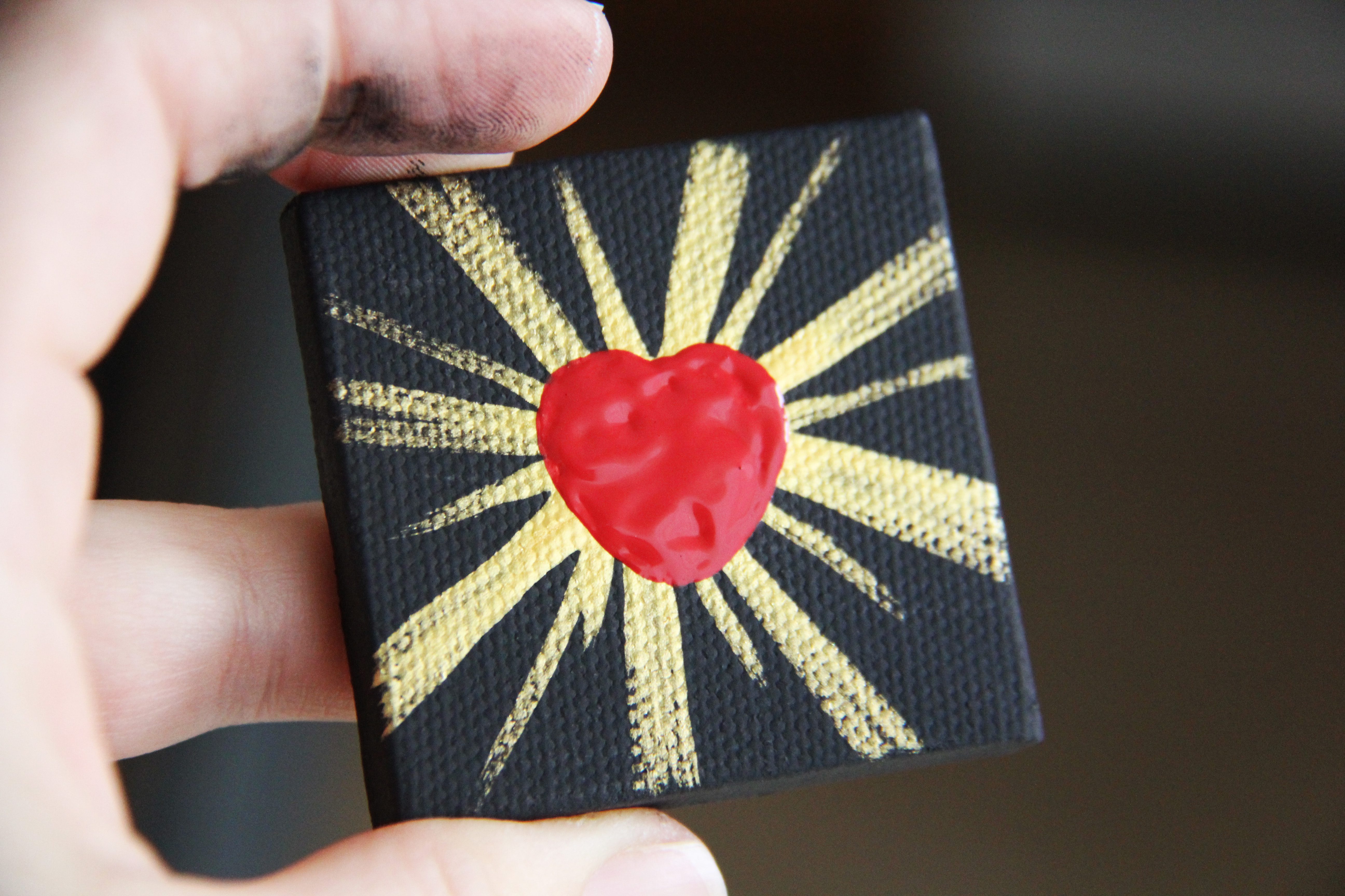 Next, we’re going to add in the fire from the top of the heart. This is super simple! Collect a droplet of yellow paint on the tip of your thin brush and set it gently at the top of the heart. Clean your brush, and then collect a smaller droplet of red paint and set it on top of the still-wet yellow droplet. See next picture.
