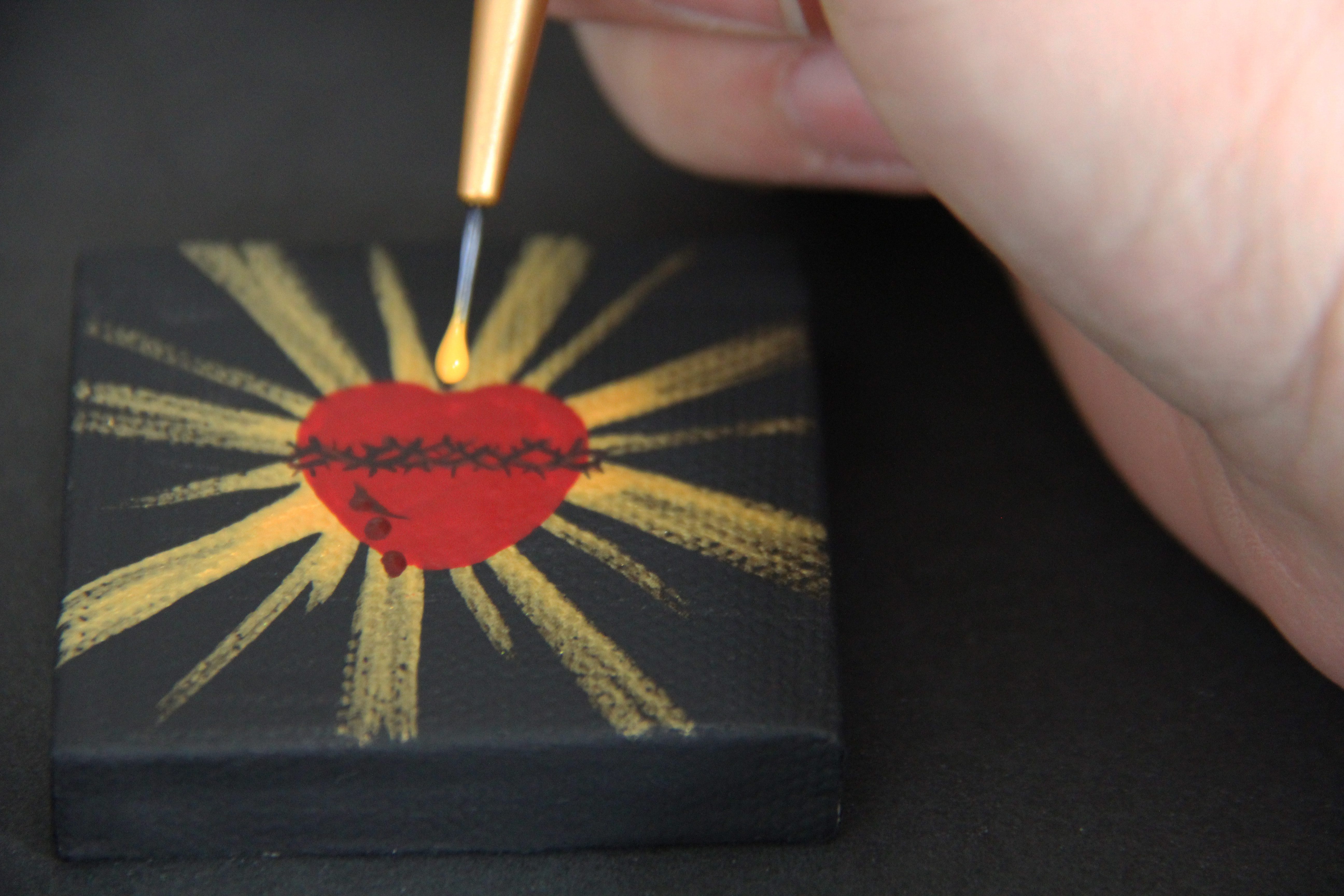 Let it dry once again. Next, using some of your brown and black paint you are going to add in the crown of thorns. This is done using the thin brush and making small curved X’s, layering the brown and black to give the illusion of layers of thorns and shadow. At this point, paint in the wound and add drops of blood. I darkened some of the red paint with some brown to use to paint the blood droplets.