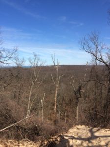 We chose a trail we’ve walked many times, climbing one dune and then heading straight to the lake. However, with the older kids running ahead of us, they wanted to try a “new” path. We veered off from our original plan to trail 8. We figured we would just climb the one extra dune and then meet up with our original trail back to the beach. Reaching the peak of the dune we enjoyed the beautiful view. The cold temperatures and the breeze were much more tolerable while moving. After a quick break, we headed back on the trail toward our original trail. It’d all be downhill from there, we thought.