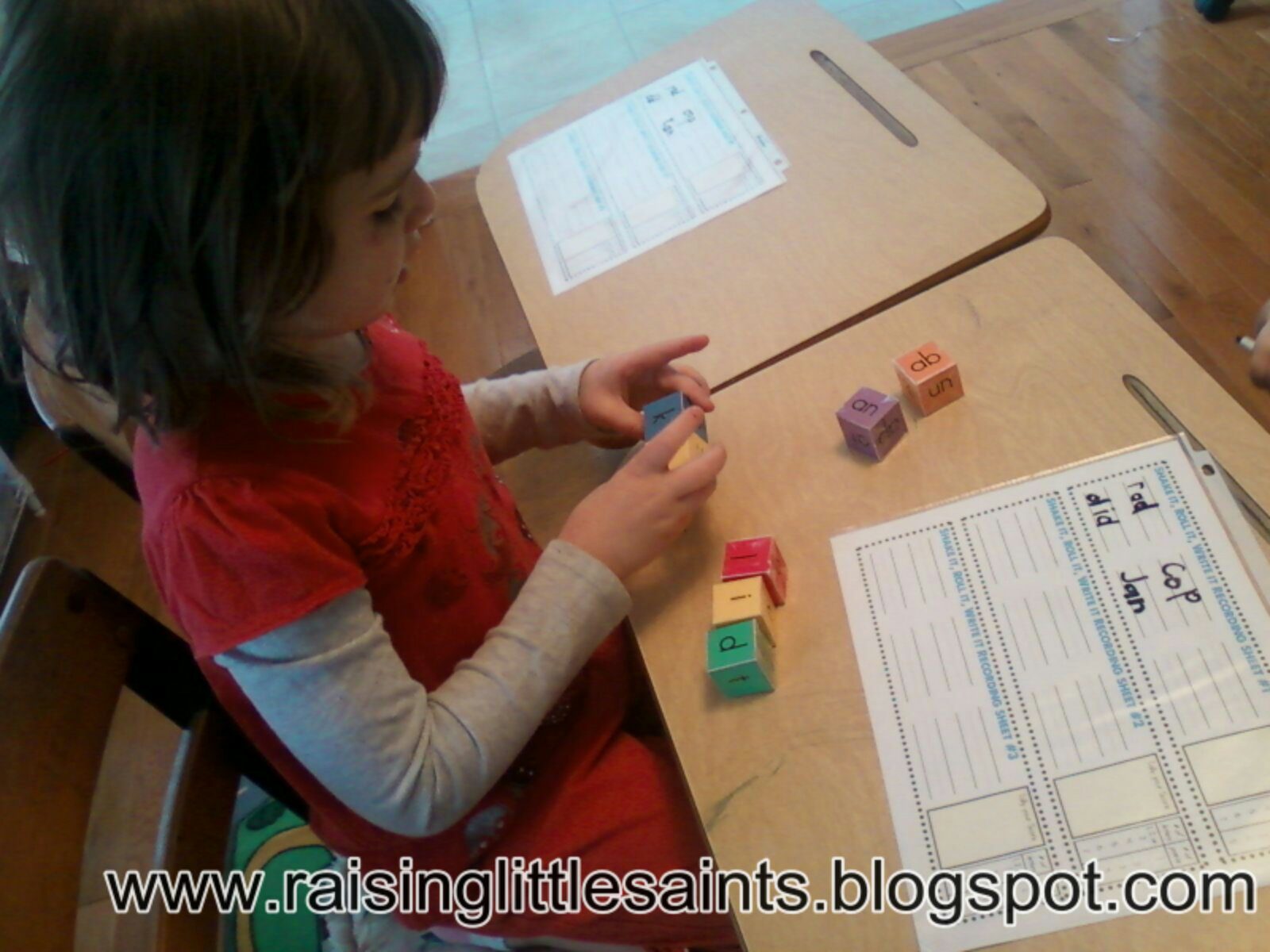 Here are pictures of my children playing the game, they roll the die and use the letters to create words. The longer the word the more points they get. It is a great game to play on Mondays to get them going or even as a center when one or two children have finished work and you still need to finish working with other students.