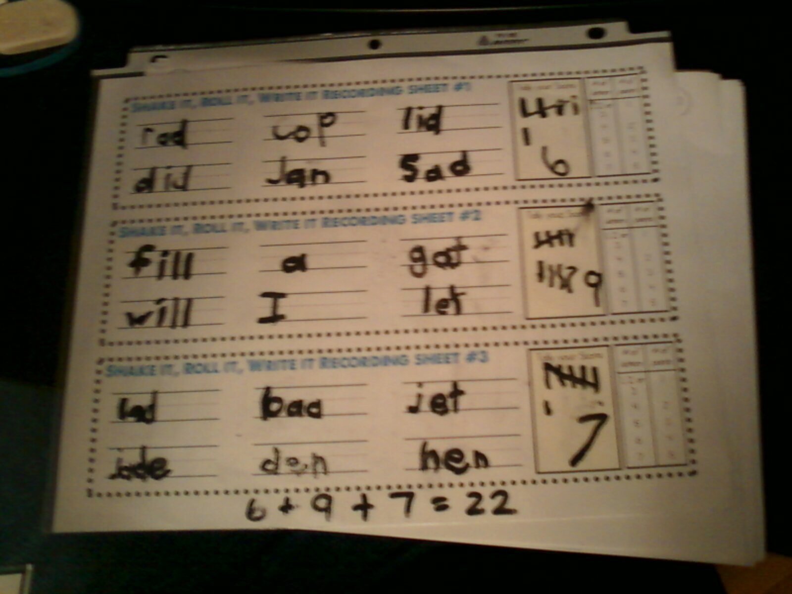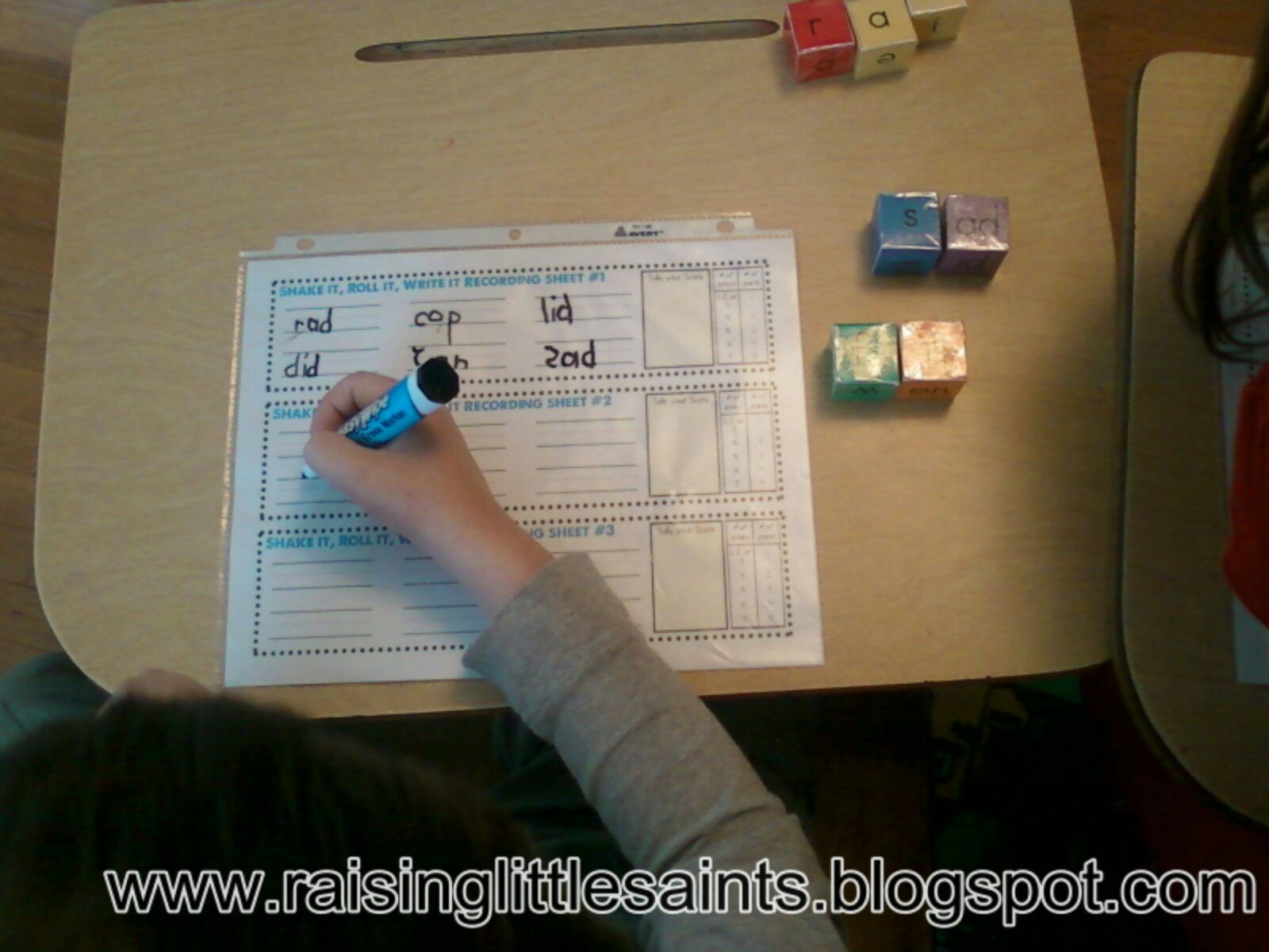 This next game I call: “Shake it, Roll it, and Write it!” I’ve created a printable to share with you of this word game, and here are some pictures with my children when they were in kinder and first graders using this game to learn new words or practice old one.