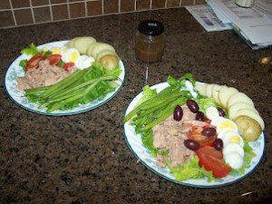 When you’re ready to prepare dinner, steam the green beans. While those are steaming create a small bed of lettuce on each plate to be the base of your salad. Once the green beans are tender place as many as desired on top of the lettuce on one side of each plate. Slice the tomatoes, potatoes, and eggs (after peeling the shells off) and place in rows on each plate.