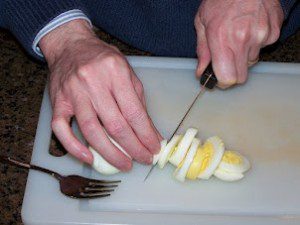 Boil the eggs and potatoes until done and then place in the refrigerator to cool (preferably 2-3 hours).