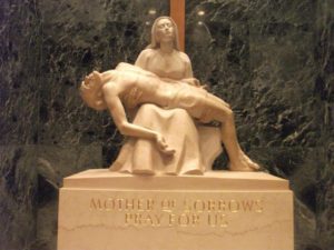 Now, every time I saw Him at mass I felt abandoned and alone. The security I knew before in my almighty God disappeared into a fear I had never known. This was a new world where my children could die. Where was God? “Where you there when they nailed him to the tree?” I saw myself holding my dying baby… were you there? The more I tried to consider Jesus’ sacrifice the more I wondered where his triumph was. My baby was dead! He let her die. Did Mary know my pain? Her son was God. Did God know my pain? His son was coming home to Him, not away from Him. I knew in my intellect that God allowed His son to die so my daughter could be in heaven with Him. All my heart could feel was her absence.